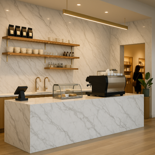 Design is your first salesperson. A marble-look wall behind a retail cashwrap says “considered, trustworthy, premium” before a single greeting is exchanged. In offices, a reception desk clad in light-veined panels suggests clarity and focus; in tech hubs, a darker stone look paired with matte black metal reads modern and confident. Cafés benefit from that quiet-luxury mood where the product can shine the latte art looks more intentional, the pastries look crafted, and even the merch display gets a halo of credibility. PVC marble sheets give you that story with less risk and less maintenance than real stone, which matters when margins are real and time is short.